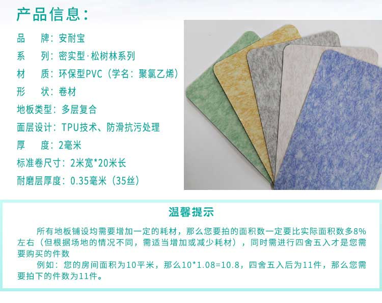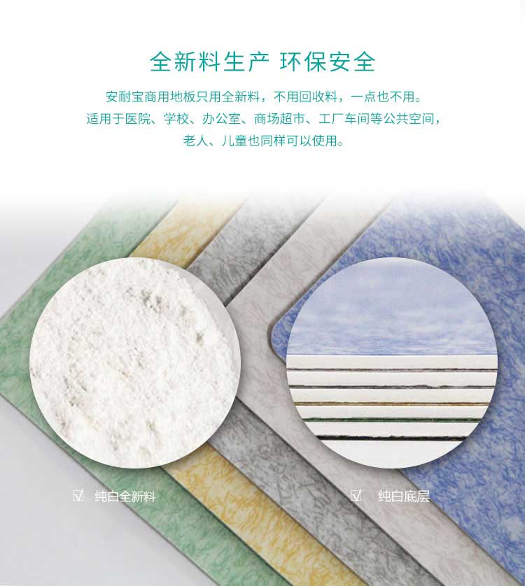 安耐寶pvc地板只用全新料,不用回收料,一點也不用。適用于醫(yī)院、學(xué)校、辦公室、商場超市、工廠車間等公共空間老人、兒童也同樣可以使用。