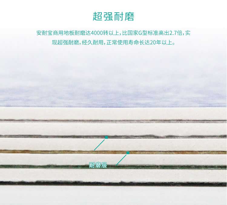 安耐寶pvc地板耐磨達(dá)4000轉(zhuǎn)以上,比國家G型標(biāo)準(zhǔn)高出2.7倍,實現(xiàn)超強耐磨,經(jīng)久耐用,正常使用壽命長達(dá)20年以上。
