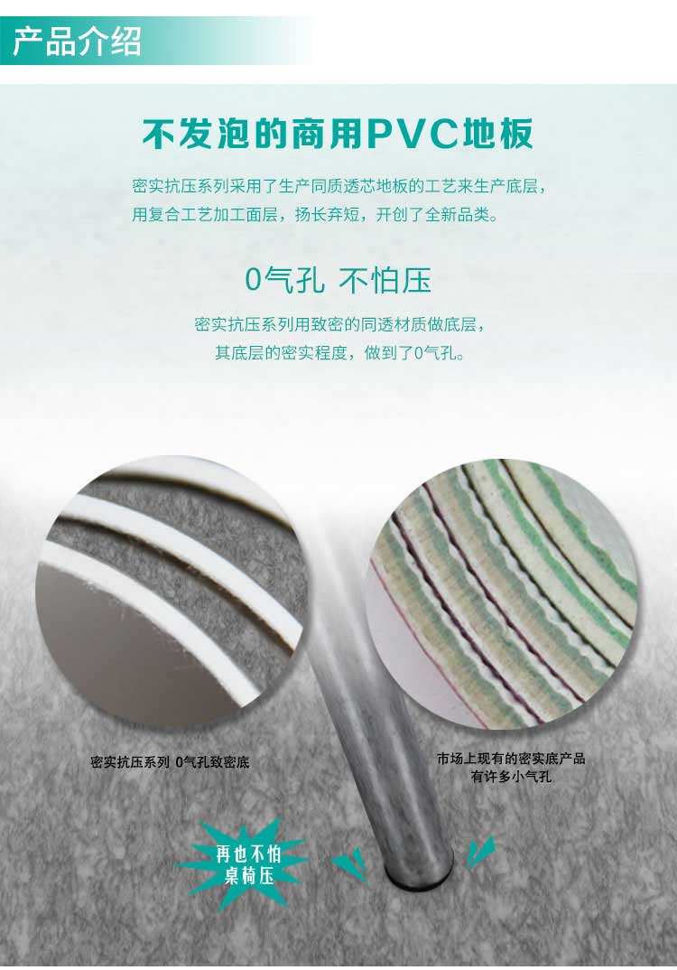 密實抗壓系列采用了生產(chǎn)同質(zhì)透芯地板的工藝來生產(chǎn)底層,用復(fù)合工藝加工面層,揚長棄短,開創(chuàng)了全新品類。