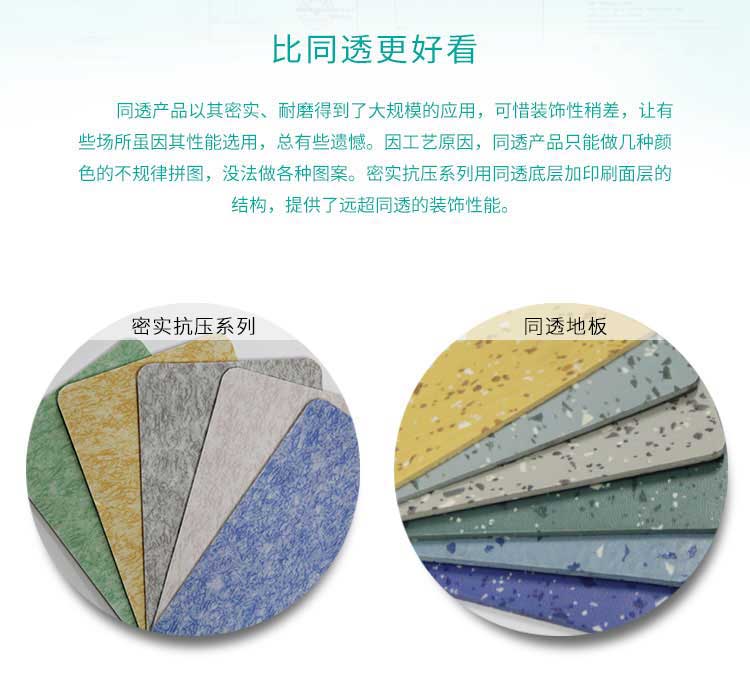 同透產(chǎn)品以其密實、耐磨得到了大規(guī)模的應(yīng)用,可惜裝飾性稍差,讓有些場所雖因其性能選用,總有些遺憾。因王藝原因,同透產(chǎn)品只能做幾種顏色的不規(guī)律拼圖,沒法做各種圖案。密實抗壓系列用同透底層加印刷面層的結(jié)構(gòu),提供了遠(yuǎn)超同透的裝飾性能。